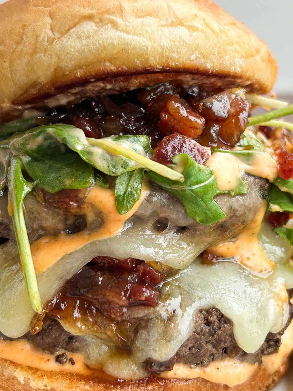 - To a toasted bun, add some burger sauce, followed by a burger patty, bacon onion jam, and arugula. Top with more burger sauce as desired and enjoy warm!