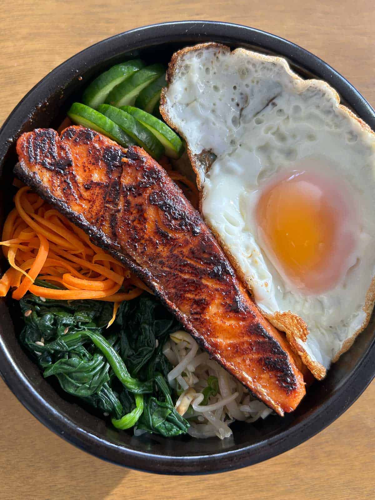 - To two bowls add rice, spinach, soybean sprouts, seasoned carrot, and sliced cucumber. Place a salmon portion on top of each bowl and top with a fried egg. Drizzle with reserved gochujang sauce and mix the bowl thoroughly before enjoying.1 cup Cooked white rice, 1 cucumber, Reserved gochujang sauce, 2 Fried eggs