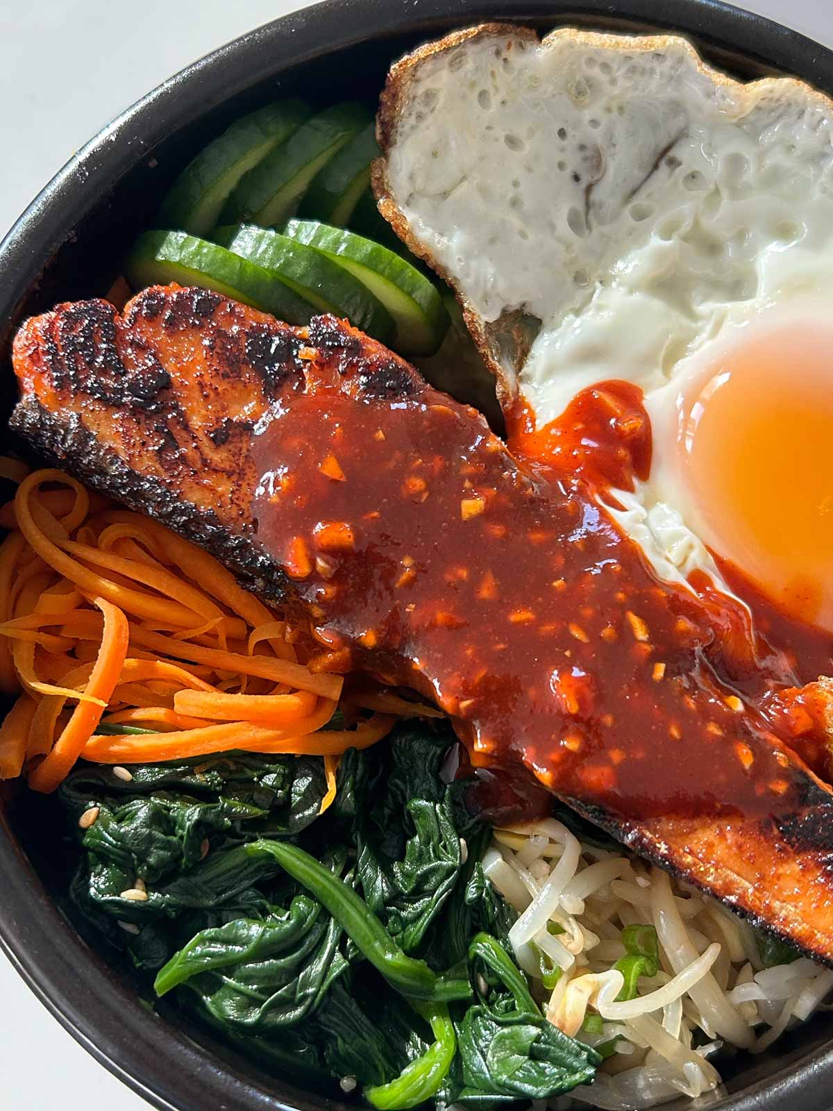 - Step 9: To two bowls add rice, spinach, soybean sprouts, seasoned carrot, and sliced cucumber. Place a salmon portion on top of each bowl and top with a fried egg. Drizzle with reserved gochujang sauce and mix the bowl thoroughly before enjoying.