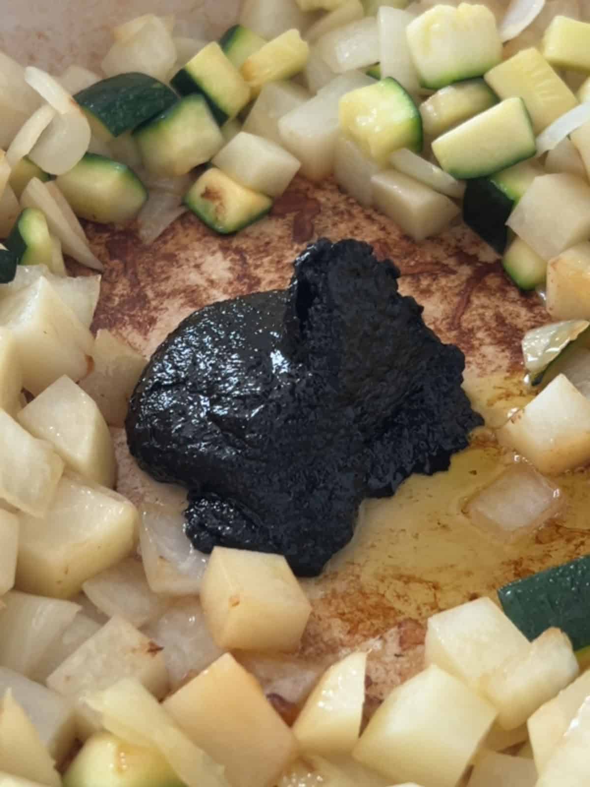 • To the middle of the pan, add a tablespoon of oil and the black bean paste. Sauté the black bean paste for 3-4 minutes, stirring constantly so it doesn’t burn.