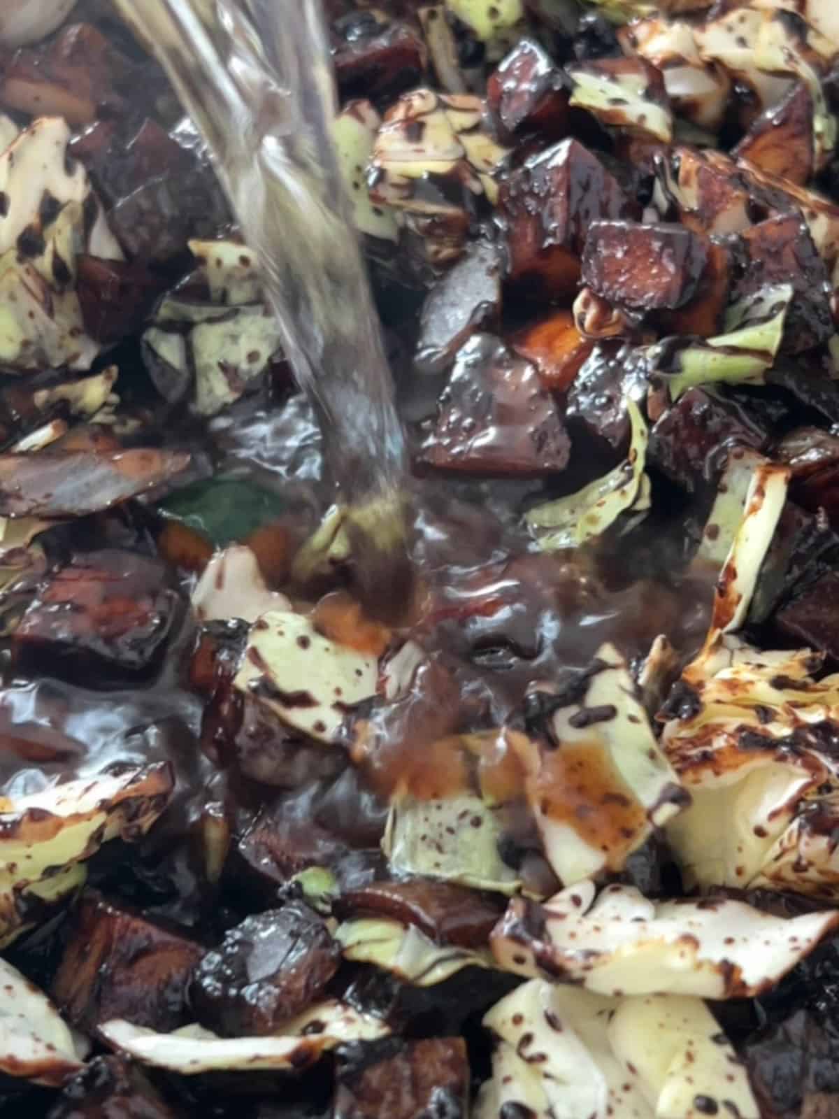• Add cabbage and 2 cups of water and cover. Bring to a gentle boil until potatoes are tender and cabbage has softened slightly, about 5-10 minutes. Stir in brown sugar and oyster sauce. Add salt to taste, starting with ½ a teaspoon.