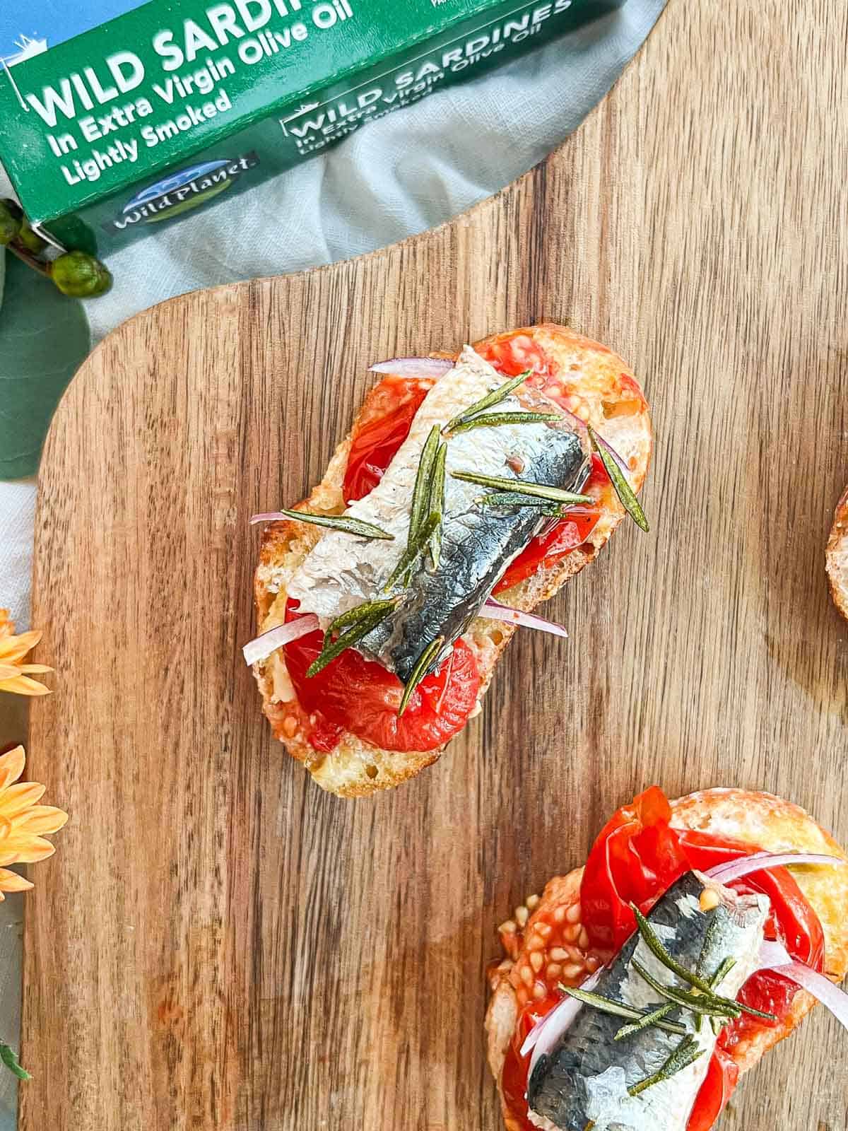 Sardines on roasted tomatoes on baguette slices on a board.