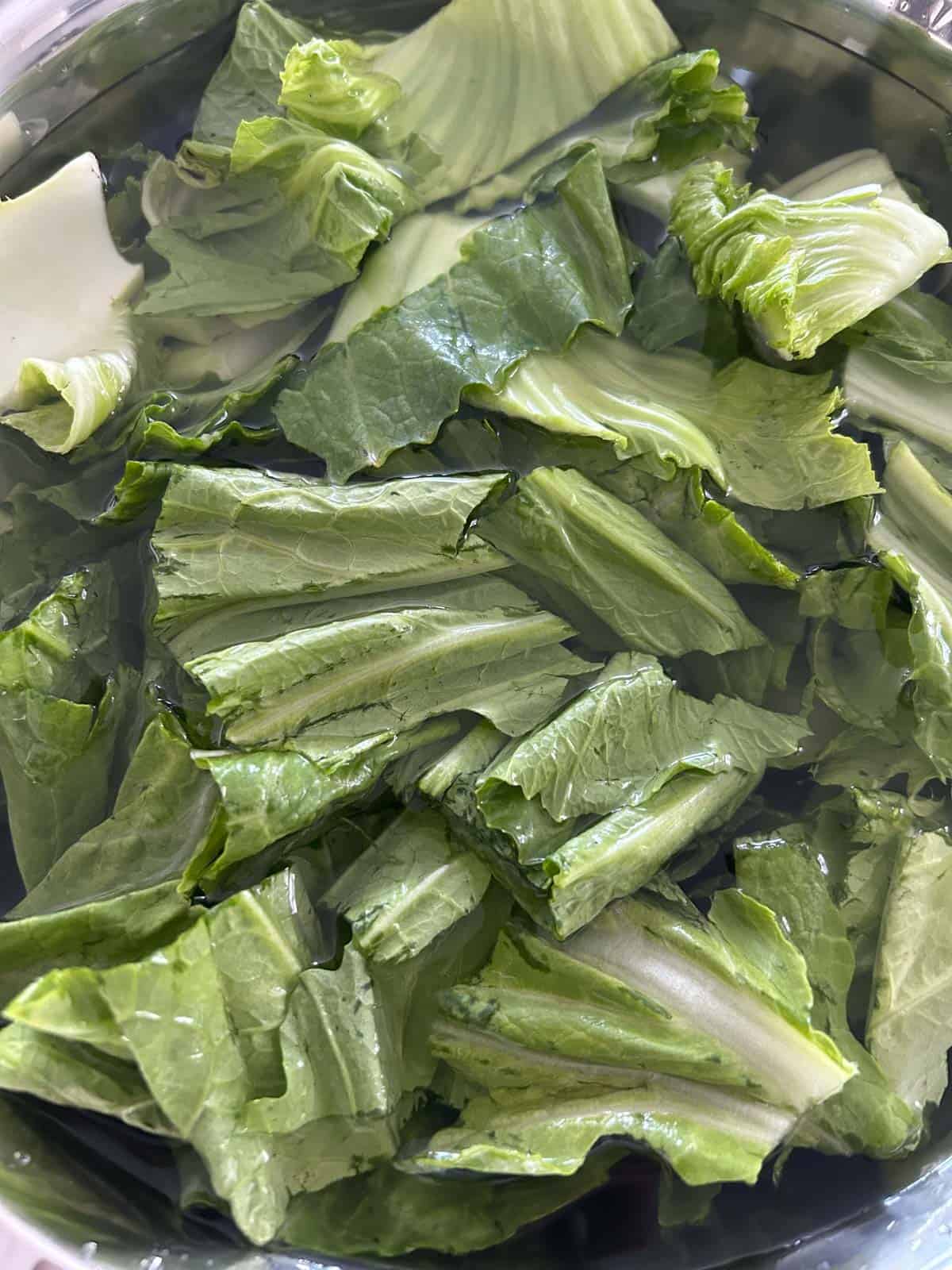 • Wash the mustard greens very well: Mustard greens are very dirty vegetables. Chop them up to help loosen the dirt and make it easier to clean. Use a brush to get in every crevice of the mustard greens to remove the dirt.