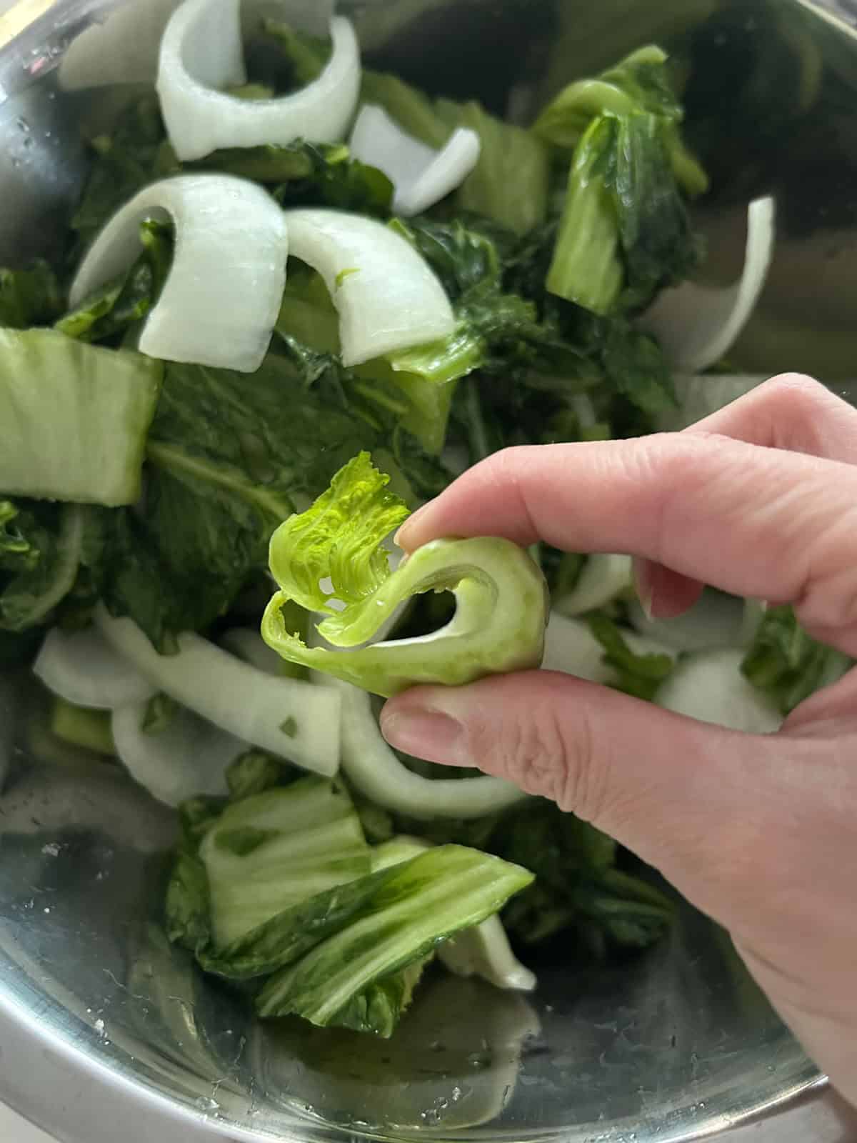 • To a large bowl, add the mustard greens and onion. Sprinkle 4 tbsps of salt over the mustard greens and onion. Use your hand to give it a good mix. Allow to sit for 15-30 minutes or until the mustard greens can bend slightly without snapping. Rinse thoroughly to remove any salt and drain well.