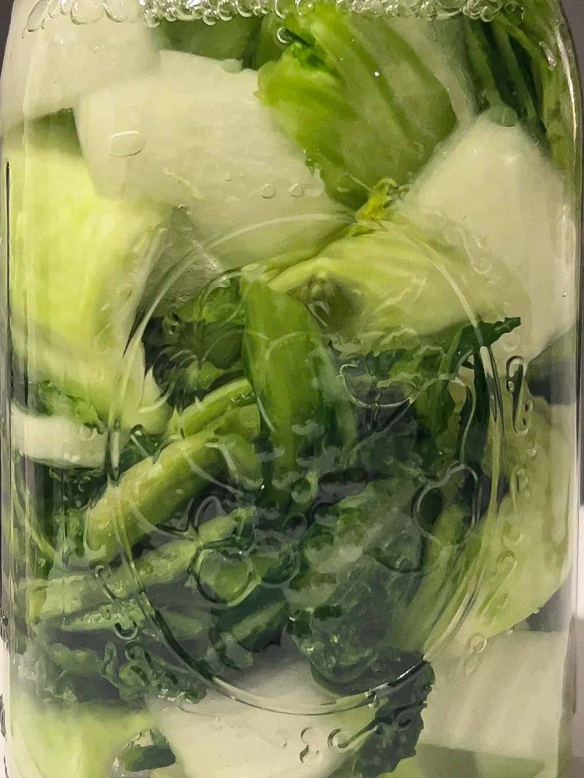 • Ensure the mustard greens are submerged in the brine: Any mustard greens exposed to air can develop mold, so pack the jar tightly or add a weight on top to keep the mustard greens submerged. Alternatively, add the lighter, leafier ends in first before adding in the thicker, stalkier ends. This will help weigh down the leafy floaters.