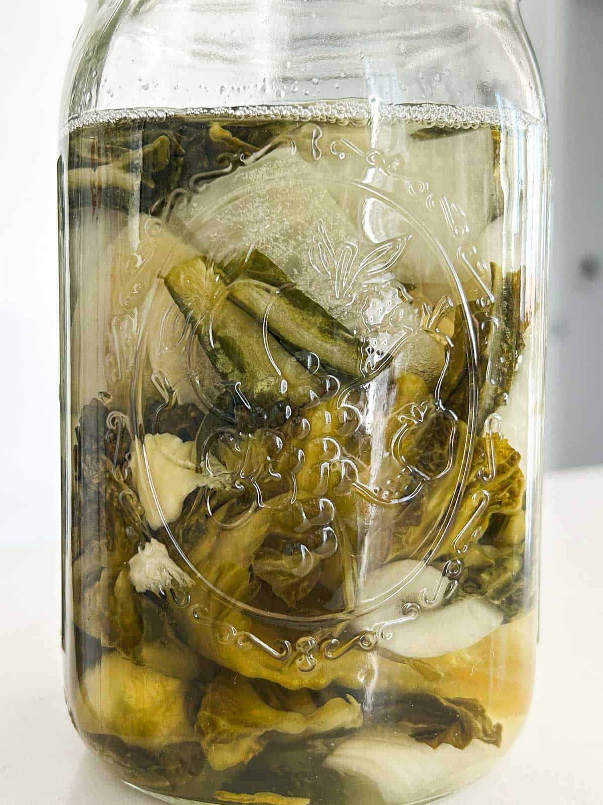Ensure the mustard greens are submerged in the brine: Any mustard greens exposed to air can develop mold, so pack the jar tightly or add a weight on top to keep the mustard greens submerged. Alternatively, add the lighter, leafier ends in first before adding in the thicker, stalkier ends. This will help weigh down the leafy floaters.