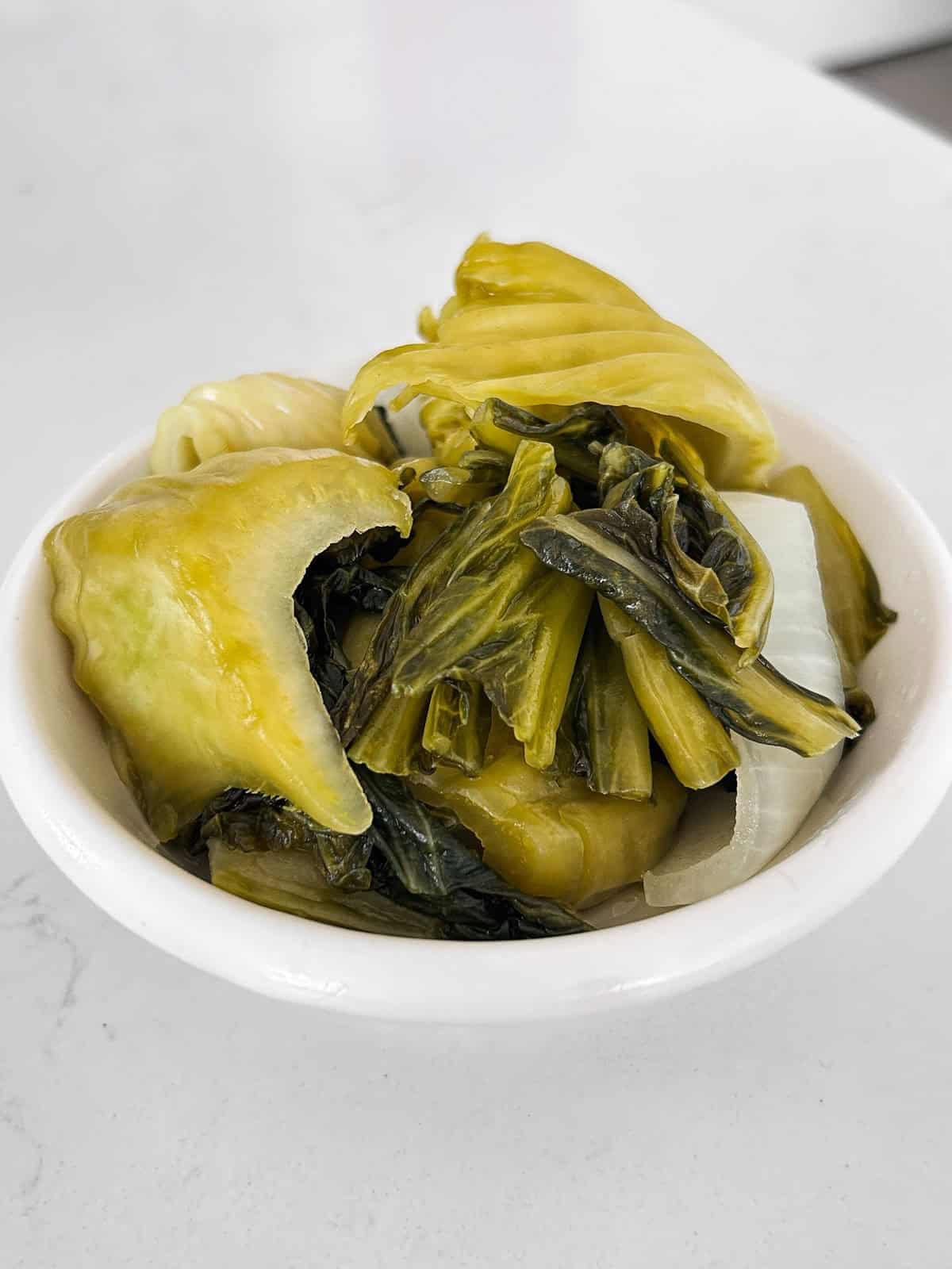 Pickled mustard greens are commonly eaten during Tet (Vietnamese New Year) with thit kho trung (Vietnamese braised pork belly and eggs) and banh chung (Vietnamese savory stuffed sticky rice) but can be eaten with noodle soups, congee, and stir fried dishes too!