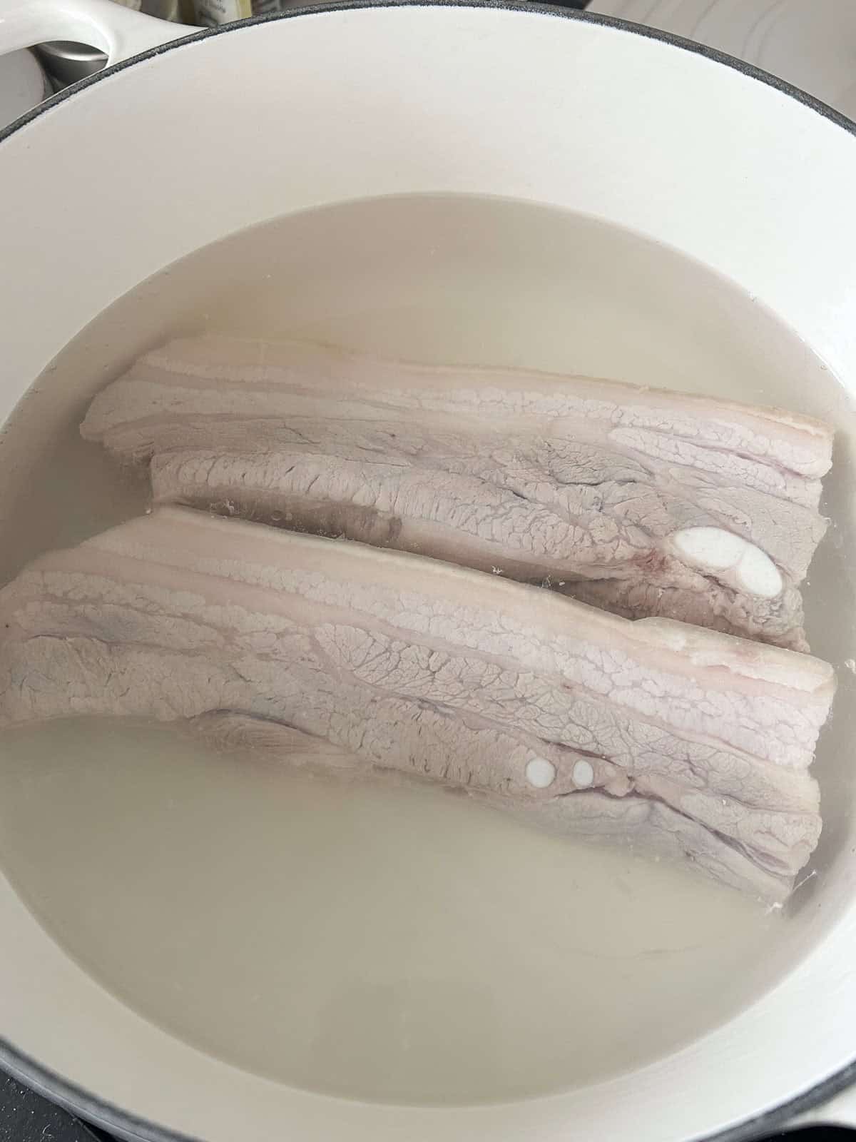 - Bring a large pot of water to a boil. Add in the pork belly, return to a boil and parboil for 5-10 minutes. Drain and rinse under cold water.