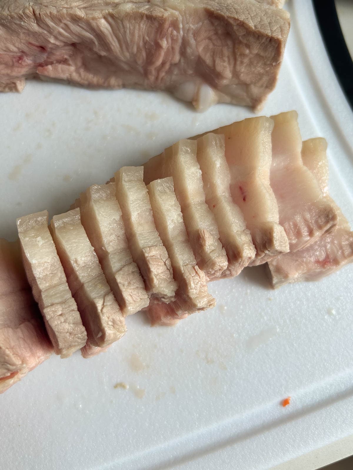 - Pat pork belly dry and slice into thin pieces, about 1 centimeter thick.
