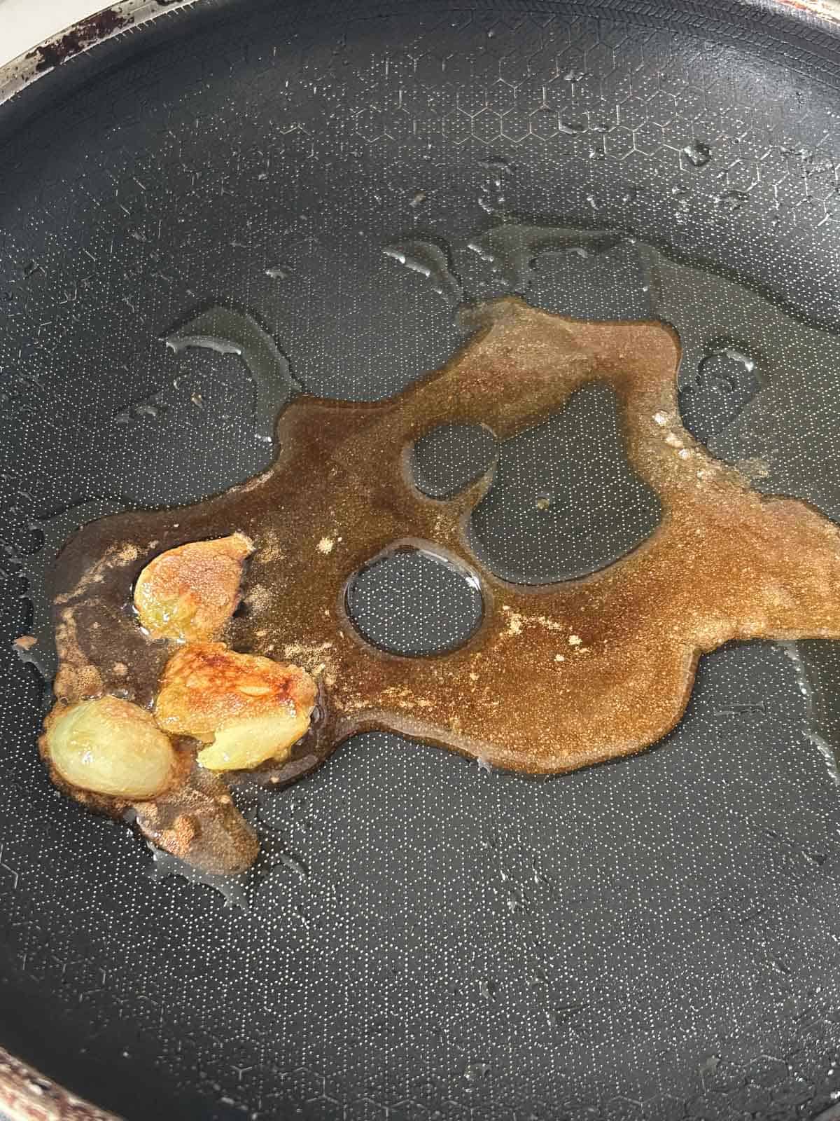 - To a large pan or pot over low heat, add garlic and oil. Saute briefly for 30 seconds or until fragrant and add sugar. Allow sugar to melt and caramelize. Once the sugar begins to melt, stir the melted sugar with the unmelted sugar to help the sugar caramelize evenly.