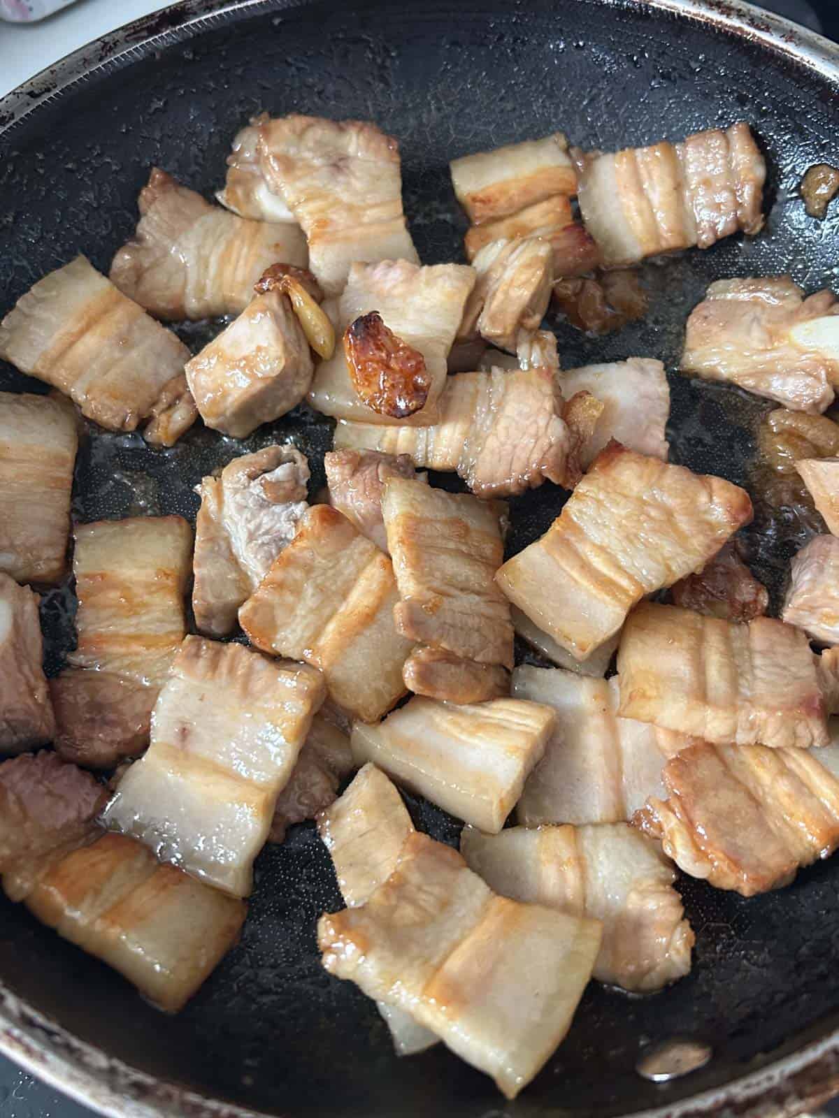 - Step 4: Once the sugar is caramelized to a light amber, carefully add pork belly slices. Be cautious of any oil and caramel splattering. Sear it on one side until lightly caramelized and flip. Some of the caramel will seize up and that is ok!